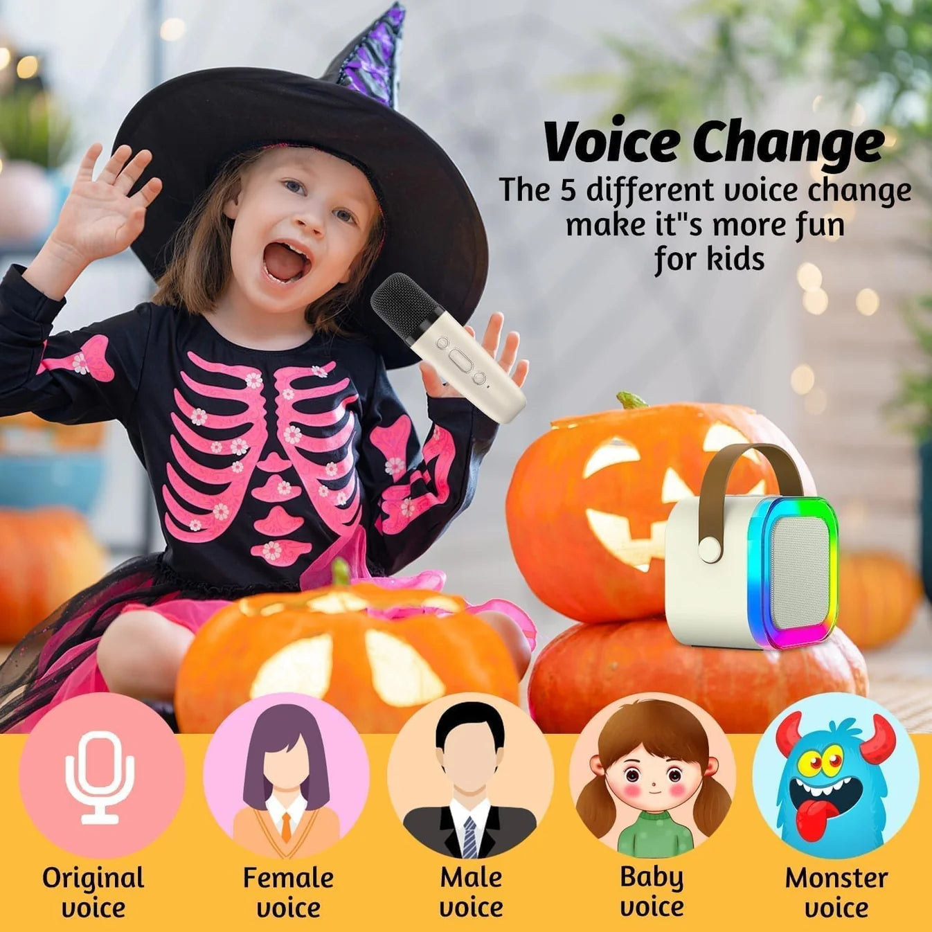 • Voice Changer Mini Karaoke Machine with 2 Mic- Multi function karaoke machine toys can switch 5 kinds of magic voices,original voice, mail voice , female voice , baby voice, monster voice, very interesting for kids toys. It also features an accompaniment mode that removes original vocals, with amazing KTV like sound and perfect echo effects